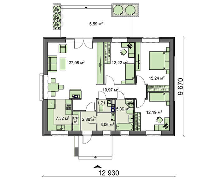 Проект содержит три раздела – Архитектурный, Конструктивный и Инженерный: водоснабжение, отопление, вентиляция, канализация, электроснабжение (приобретается за дополнительную плату) + Пояснительная записка.