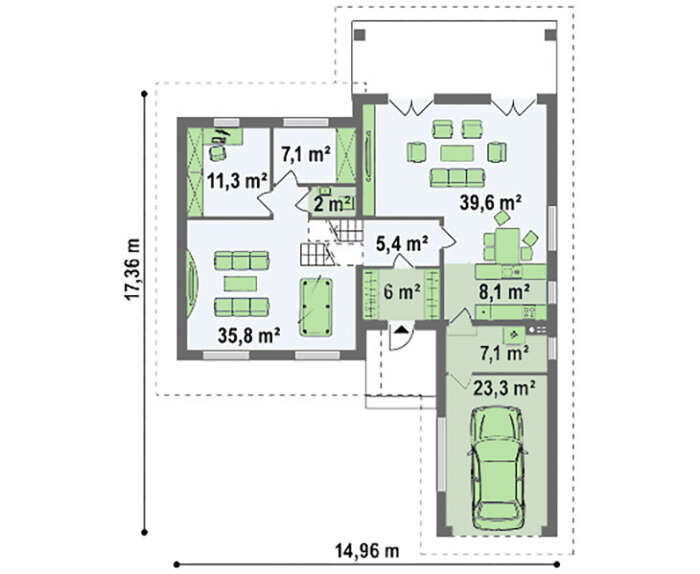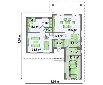 Проект содержит три раздела – Архитектурный, Конструктивный и Инженерный: водоснабжение, отопление, вентиляция, канализация, электроснабжение (приобретается за дополнительную плату) + Пояснительная записка.