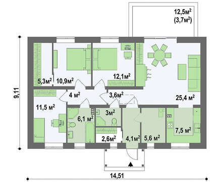 Проект содержит три раздела – АрхитектурныйКонструктивный и Инженерный: водоснабжение, отопление, вентиляция, канализация, электроснабжение (приобретается за дополнительную плату) + Пояснительная записка.