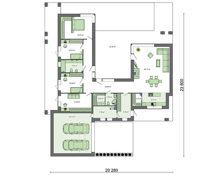 • 4M7080 Проект дома с плоской крышей и гаражом для 2 авто общей площадью 263 кв.м.