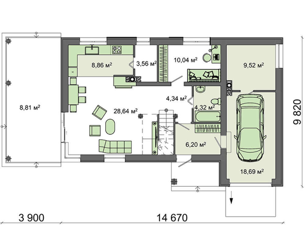 Проект содержит три раздела – Архитектурный, Конструктивный и Инженерный: водоснабжение, отопление, вентиляция, канализация, электроснабжение (приобретается за дополнительную плату) + Пояснительная записка.