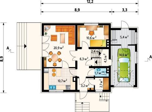 Первый этаж носит универсальный характер и рассчитан на выполнение сразу нескольких функций. Достаточно место выделено на размещение гаража под одно авто и мастерскую для хранения инструмента. Гостиная и столовая соединены в общее помещение и рассчитаны на дружеско — родственные приемы и хлебосольные обеды на одной площади. Выход из комнаты прямо на приусадебный участок и дозволенность покидать здание в любое время будет высоко оценен жителями больших городов, лишенных этой возможности. Рядом расположенная кухня позволит гостеприимной хозяйке быстро накрывать полные яств столы.
