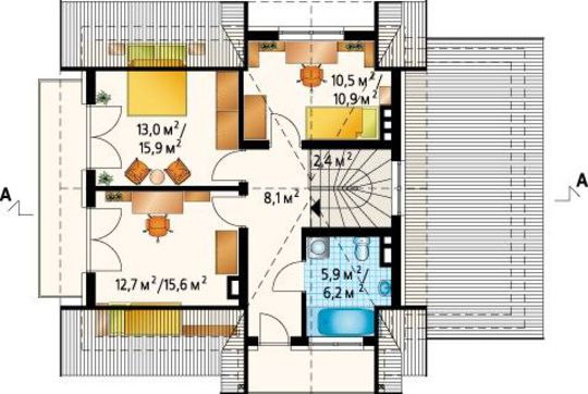 Выполняя планирование помещений, архитекторы остановились на четырех личных комнатах. Расположенную на первом этаже можно использовать для спальни, рассмотреть варианты меблировки под детскую или бизнес-кабинета. Комнаты второго этажа будут высоко оценены любителями мечтать, глядя в звездное небо, планировка рассчитана на такое времяпрепровождение.
