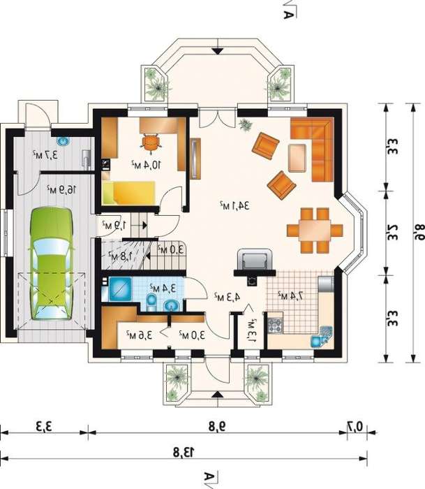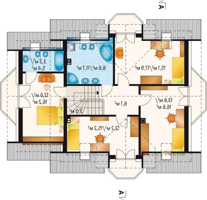 Планировка отдает много место под индивидуальные помещение. На первом этаже комнату можно использовать как для спальни, так под кабинет или игровую зону.