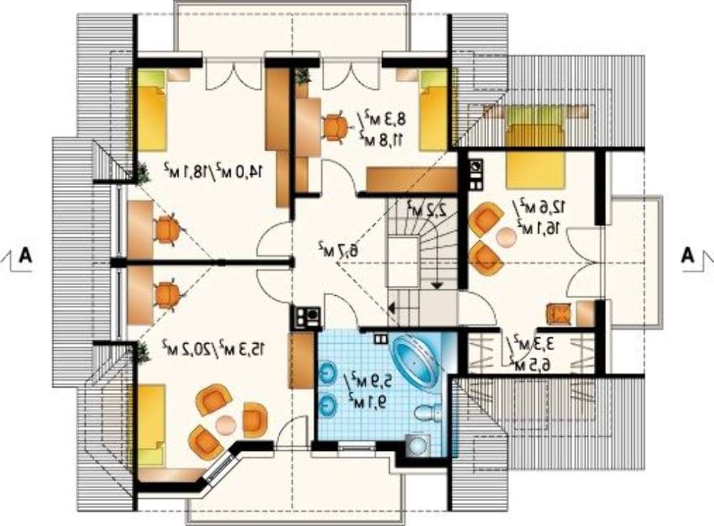 Наружная стабильность переносится внутрь. Как и положено надежному строению, тут же под одной крышей, находится гараж для машины и мастерская чтобы ее обслуживать. Спальных комнат достаточно, их пять. Все разные, непохожие по планировке, одна краше другой. Особая, с отдельным входом на террасу, находится на первом этаже. Четыре спальни, что повыше, выигрывают за счет выходов на балконы.