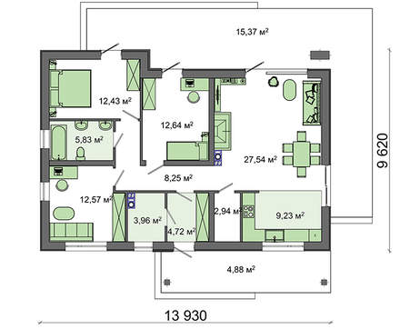 Проект содержит три раздела – Архитектурный, Конструктивный и Инженерный: водоснабжение, отопление, вентиляция, канализация, электроснабжение (приобретается за дополнительную плату) + Пояснительная записка.