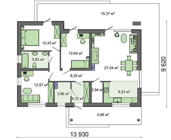 В левой части дома расположена дневная зона, состоящая из гостиной с камином и выходом на открытую террасу и кухни со столовой. Окна, расположенные с трех сторон, обеспечивают хорошее естественное освещение всего единого пространства.
