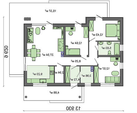 Правую часть дома занимают три спальни и ванная комната, совмещенная с прачечной. Причем, две спальни оборудованы собственными отдельными выходами на террасу.