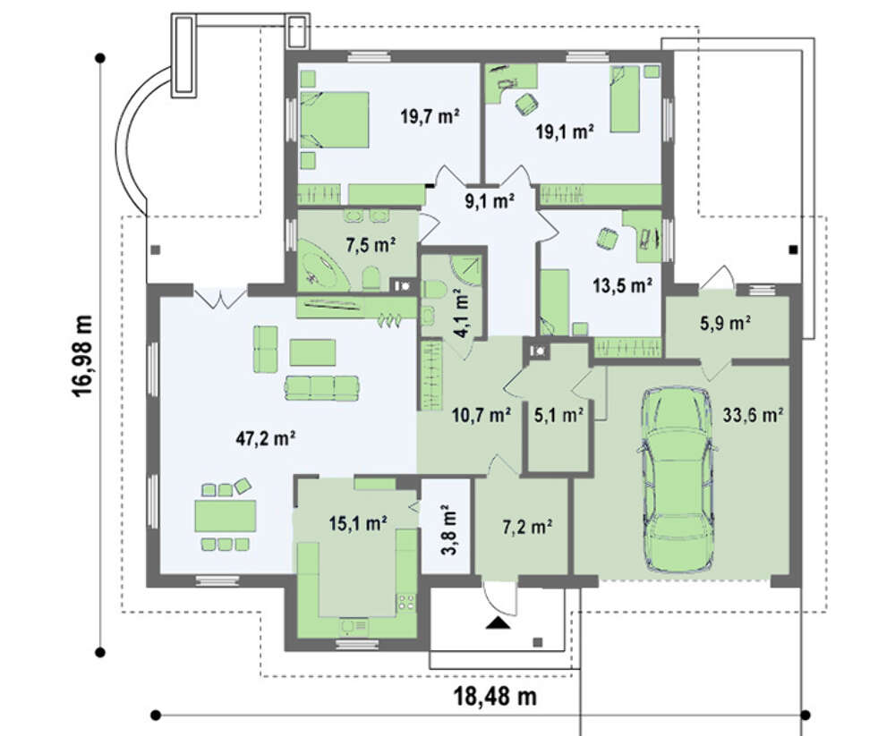 Если перед вами стоит задача найти современное жилье для четырех человек и кота, советуем обратить внимание на проект просторного одноэтажного дома с гаражом для двух машин.