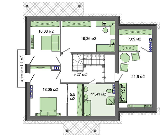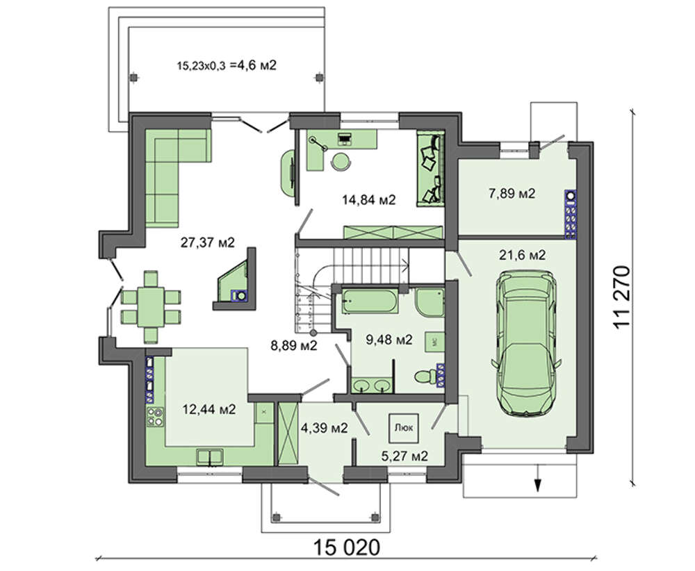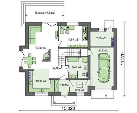 Проект содержит три раздела – Архитектурный, Конструктивный и Инженерный: водоснабжение, отопление, вентиляция, канализация, электроснабжение (приобретается за дополнительную плату) + Пояснительная записка.