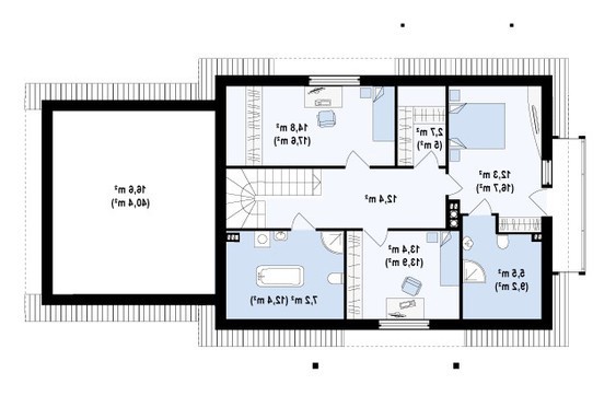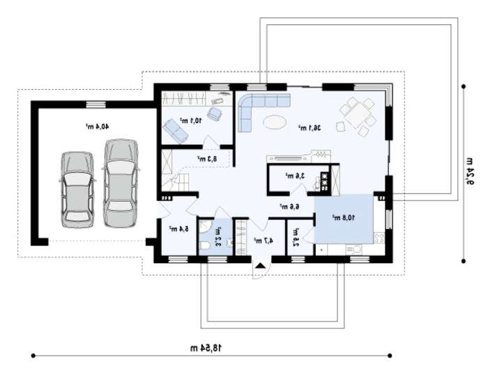За счет своей сложной формы, дневная зона делится на функциональные подзоны. Границей между ними служат камин и кладовая, вынесенная в центр помещения. В одной части расположена просторная кухня, в другой – гостиная и столовая. Стоит отметить, что в рекреационной зоне предусмотрено два выхода на угловую террасу.