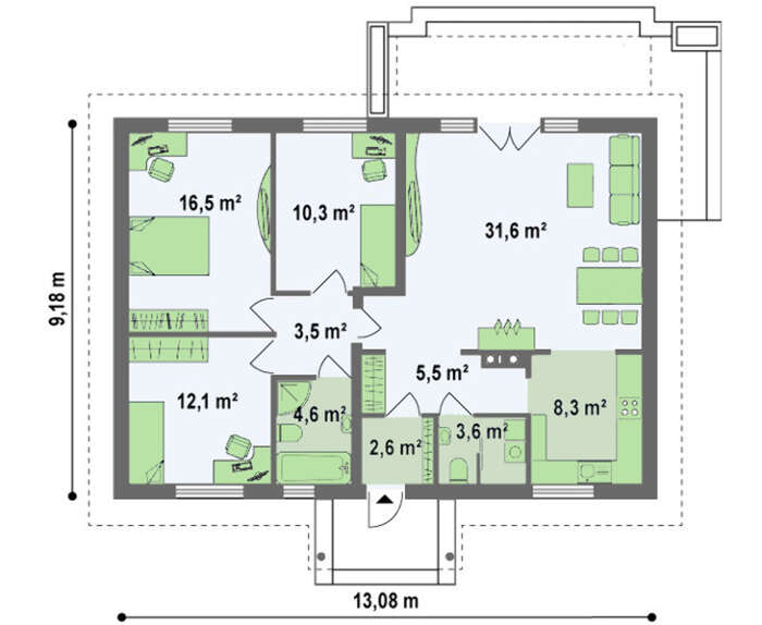 Проект содержит три раздела – АрхитектурныйКонструктивный и Инженерный: водоснабжение, отопление, вентиляция, канализация, электроснабжение (приобретается за дополнительную плату) + Пояснительная записка.