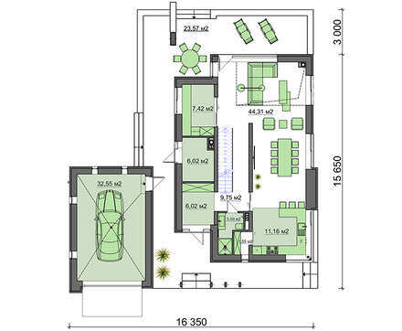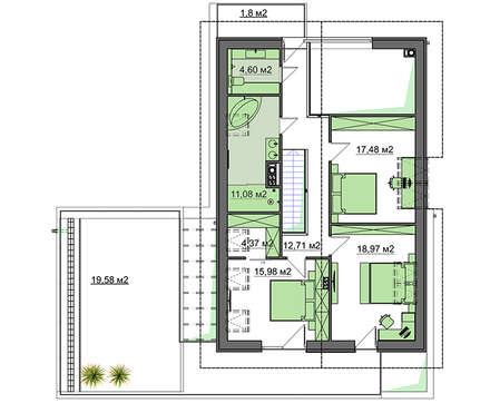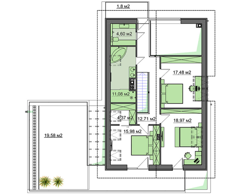 Проект содержит три раздела – АрхитектурныйКонструктивный и Инженерный: водоснабжение, отопление, вентиляция, канализация, электроснабжение (приобретается за дополнительную плату) + Пояснительная записка.