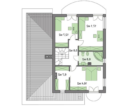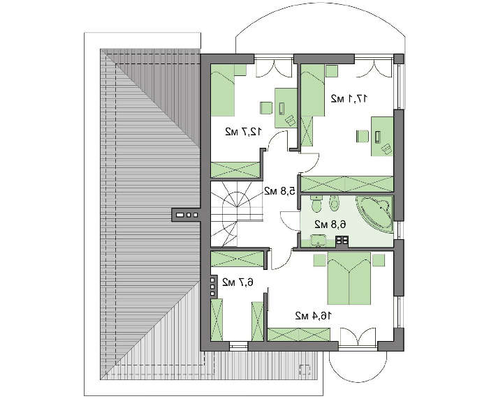 Второй этаж – это три спальни разной площади и вместительный санузел. Все жилые комнаты выходят на балконы. Особенностью хозяйских апартаментов стал гардероб почти 7 кв. м. Помещение имеет окно, поэтому при желании может быть использовано под иные цели.