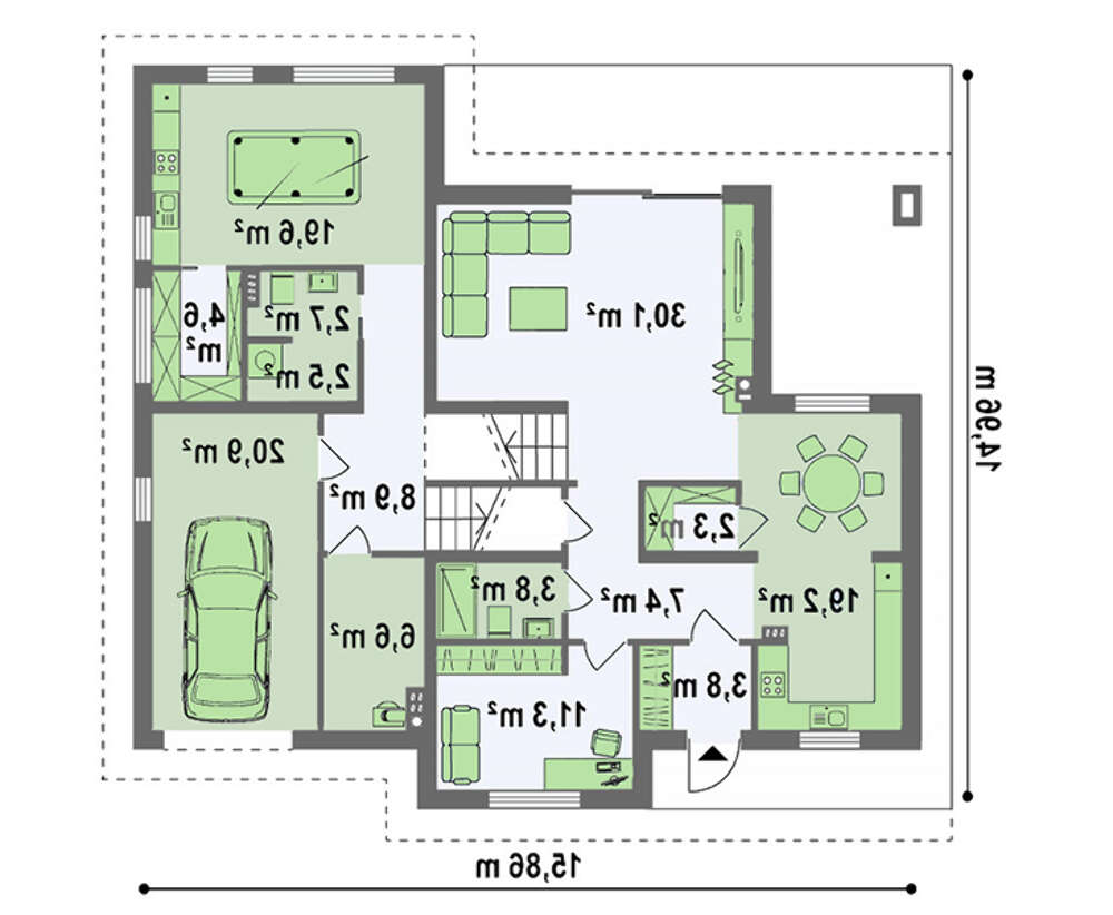 Входящий в коттедж цокольный этаж выделен для гаража и мастерской по его обслуживанию. Место приема друзей включает столовую с кухней и отдаленную от них за счет расположения гостиную. Уют и добрую атмосферу создает размещенный в центре камин. Предусмотрен выход на террасу, что помогает встречу перенести на загородный простор. В пространство первого этажа включено два помещения, которые по велению хозяина строения могут использоваться под разные назначения. Рабочий кабинет, спальное помещение, горница для отдыха, бильярда, курительные апартаменты — вот некоторые из возможных вариантов.