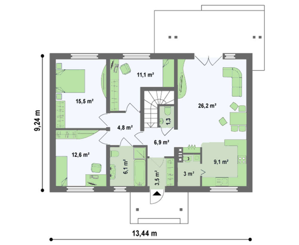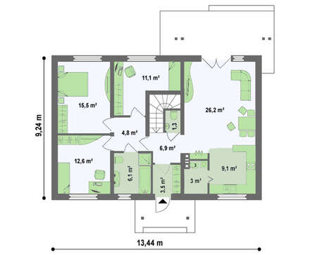 Во-первых, при сравнительно небольшой площади, за счет уменьшения размеров подсобных помещений, спроектированы максимально просторные жилые комнаты. Во-вторых, отсутствие несущих стен внутри дома дает широкие возможности для перепланировок. И, в третьих, при необходимости, чердак можно переоборудовать под жилую мансарду. В проекте предусмотрено даже место для лестницы на второй этаж.