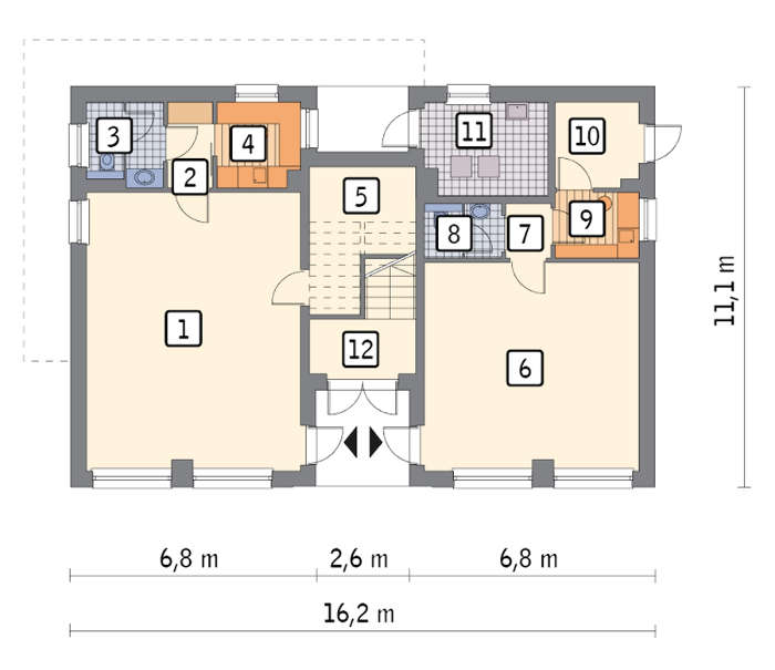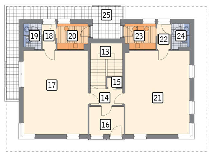 Проект содержит три раздела – Архитектурный, Конструктивный и Инженерный: водоснабжение, отопление, вентиляция, канализация, электроснабжение (приобретается за дополнительную плату) + Пояснительная записка.