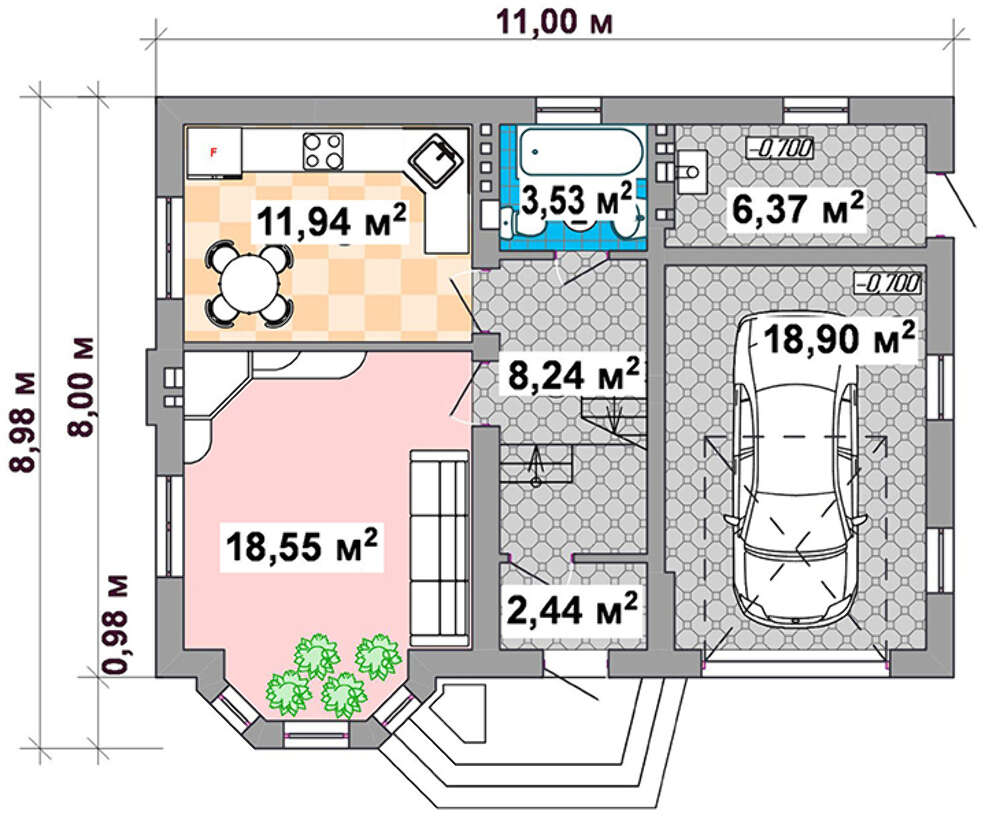 Во второй части находится гараж для хранения автомобиля и котельная. Последняя имеет отдельный вход с улицы. Это удобно для организации небольшой мастерской, которая в частном доме просто необходима.