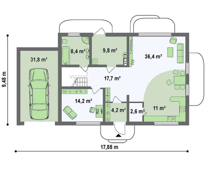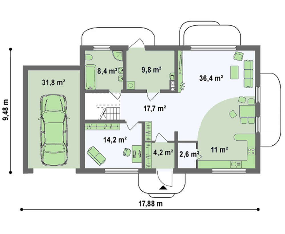Проект содержит три раздела – Архитектурный, Конструктивный и Инженерный: водоснабжение, отопление, вентиляция, канализация, электроснабжение (приобретается за дополнительную плату) + Пояснительная записка.