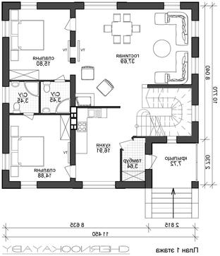 Проект содержит три раздела – Архитектурный, Конструктивный и Инженерный: водоснабжение, отопление, вентиляция, канализация, электроснабжение (приобретается за дополнительную плату) + Пояснительная записка.