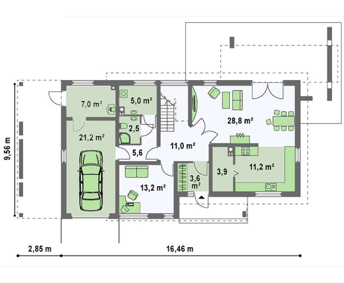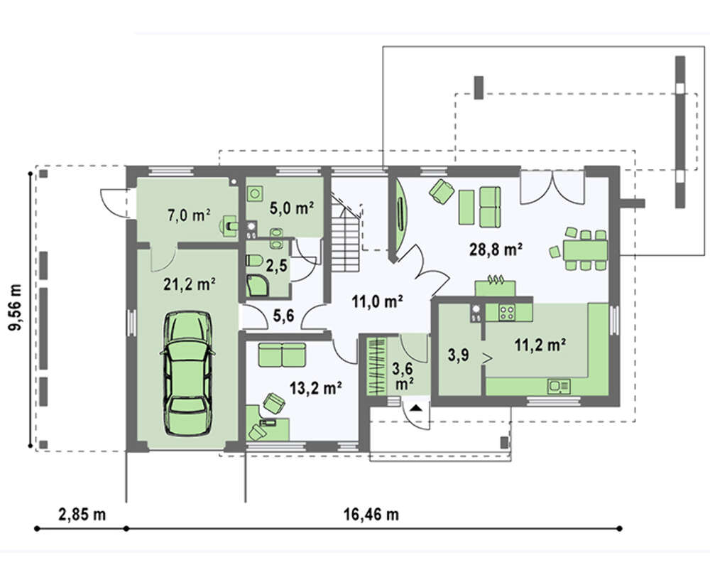 Проект содержит три раздела – Архитектурный, Конструктивный и Инженерный: водоснабжение, отопление, вентиляция, канализация, электроснабжение (приобретается за дополнительную плату) + Пояснительная записка.