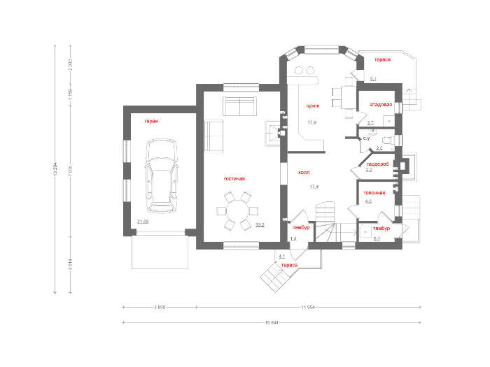 Проект содержит три раздела – Архитектурный, Конструктивный и Инженерный: водоснабжение, отопление, вентиляция, канализация, электроснабжение (приобретается за дополнительную плату) + Пояснительная записка.