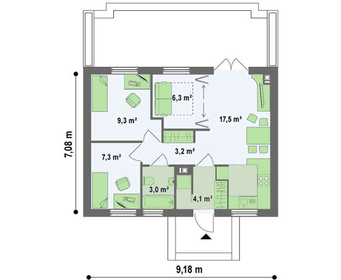 Проект содержит три раздела – Архитектурный, Конструктивный и Инженерный: водоснабжение, отопление, вентиляция, канализация, электроснабжение (приобретается за дополнительную плату) + Пояснительная записка.