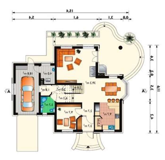 В пространстве первого этажа предусмотрены все помещения, требуемые для комфортного проживания. Отнесенный в часть пристройки гараж поможет разместить автомобиль, а небольшая мастерская решит все вопросы с хранением инструмента. Для того чтобы отдых был полноценным, гостиная отделена и имеет свой выход на загородный простор. Такие особенности планировки позволяют встречать друзей не только в помещении, но и среди красивой растительности, в тени беседок и под яркими цветочными арками.
