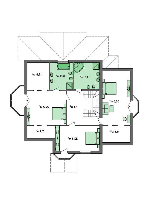 При планировании внутреннего пространства приняты меры, чтобы обеспечить комфорт проживающих и создать максимальные удобства для гостей. Спальных помещений предусмотрено четыре. Нижнего этажа имеет наименьшие размеры, но достаточны по площади чтобы разместить представителей старшего поколения, организовать детское пространство или бизнес-кабинет владельца усадьбы. Верхний этаж — это одно, двух и трехкомнатные апартаменты, с личными, выходящими на разные стороны света, балкончиками. Такое расположение гарантирует комфорт каждому члену семьи. Трехкомнатные хоромы выделены единоличным санузлом, который обеспечит максимальное уединение и удобства.