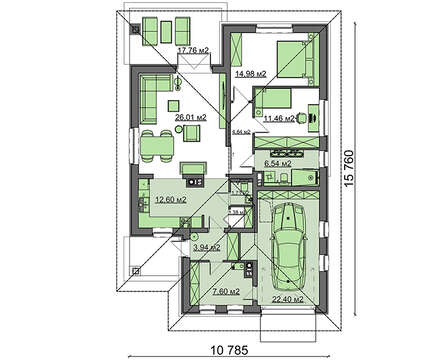 Проект содержит три раздела – Архитектурный, Конструктивный и Инженерный: водоснабжение, отопление, вентиляция, канализация, электроснабжение (приобретается за дополнительную плату) + Пояснительная записка.