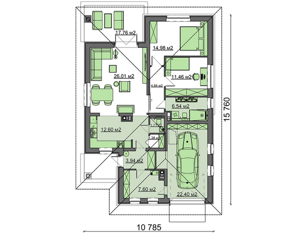 Проект содержит три раздела – Архитектурный, Конструктивный и Инженерный: водоснабжение, отопление, вентиляция, канализация, электроснабжение (приобретается за дополнительную плату) + Пояснительная записка.