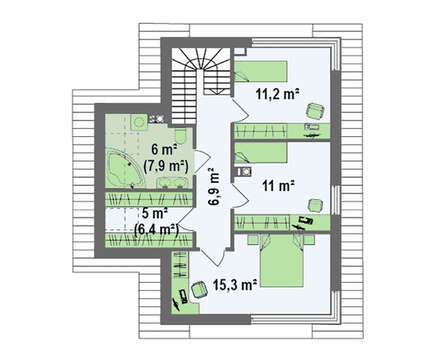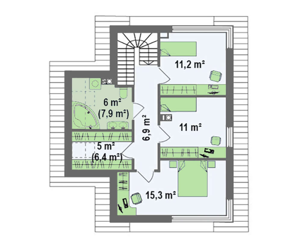 За счет угловых окон, в ночной зоне, расположенной в мансарде, создается ощущение уюта и домашнего тепла. Три спальни, просторная ванная комната с прачечной и вместительная гардеробная полностью удовлетворяют потребности всей семьи в комфорте.