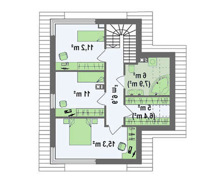 За счет угловых окон, в ночной зоне, расположенной в мансарде, создается ощущение уюта и домашнего тепла. Три спальни, просторная ванная комната с прачечной и вместительная гардеробная полностью удовлетворяют потребности всей семьи в комфорте.