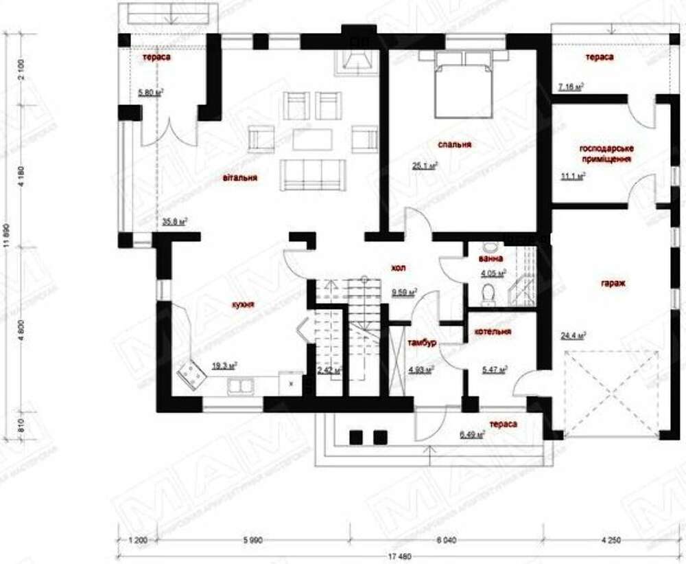 Проект содержит три раздела – Архитектурный, Конструктивный и Инженерный: водоснабжение, отопление, вентиляция, канализация, электроснабжение (приобретается за дополнительную плату) + Пояснительная записка.