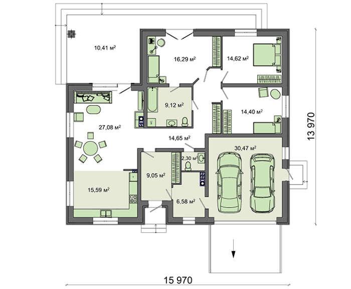 Проект содержит три раздела – АрхитектурныйКонструктивный и Инженерный: водоснабжение, отопление, вентиляция, канализация, электроснабжение (приобретается за дополнительную плату) + Пояснительная записка.