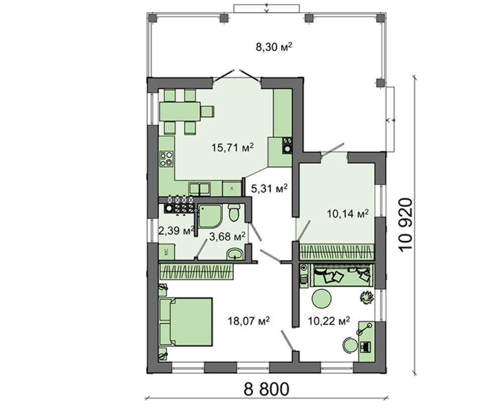 Проект содержит три раздела – Архитектурный, Конструктивный и Инженерный: водоснабжение, отопление, вентиляция, канализация, электроснабжение (приобретается за дополнительную плату) + Пояснительная записка.