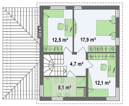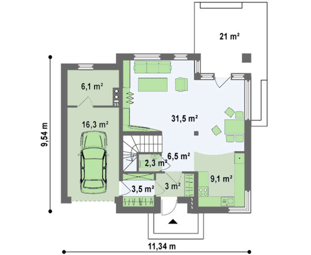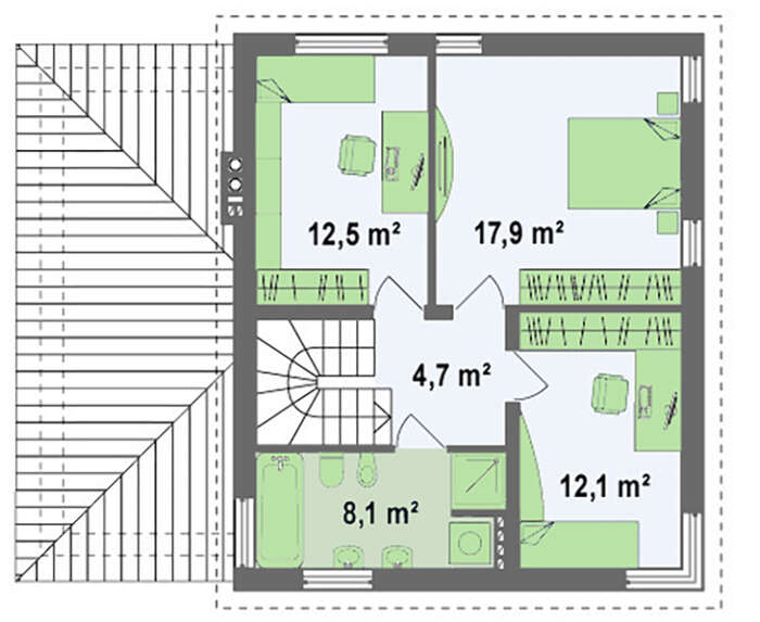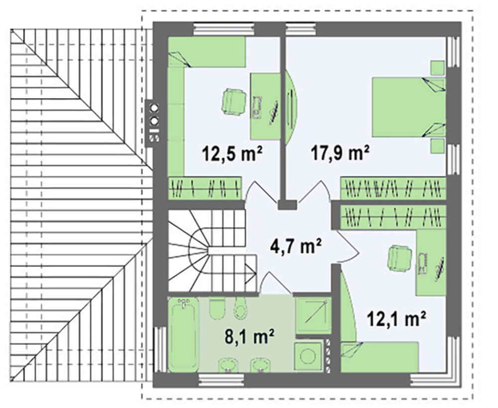 • 4M668 Компактный проект двухэтажного современного коттеджа с тремя спальнями и гаражом