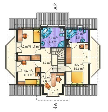 Двухэтажное строение жилой площадью 100 м2 сможет стать надежным приютом для большой и дружной семьи, уважающей интересы каждого члена, при этом предпочитающей много времени проводить вмести. Большие размеры гостиного пространства первого этажа позволяют организовывать светские рауты, принимать родственников на годовщины и юбилеи, встречать толпы детей на детских утренниках. Компактный эркер делает пространство необыкновенным и достойным восхищения.