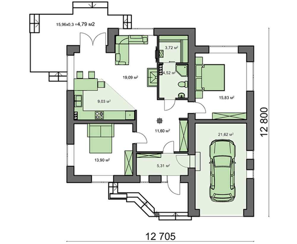 Проект содержит три раздела – Архитектурный, Конструктивный и Инженерный: водоснабжение, отопление, вентиляция, канализация, электроснабжение (приобретается за дополнительную плату) + Пояснительная записка.