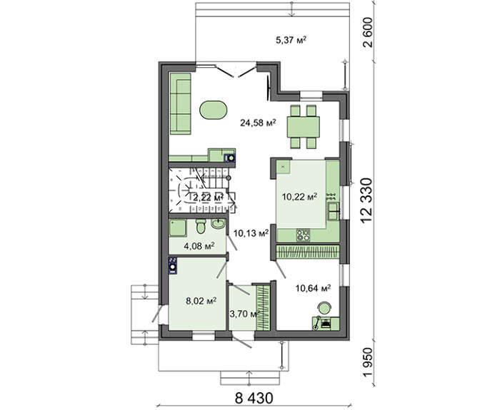 Для того чтобы расширить возможности для отдыха и позволить хозяевам и их гостям больше времени проводить на свежем воздухе, предусмотрен дополнительный выход из гостиной прямо на террасу и оттуда на загородную территорию. Помимо студии, на первом этаже находится топочная, санузел и спальня. Компактное личное помещение позволит с комфортом разместиться старшим членам семьи или людям с ограниченными возможностями.
