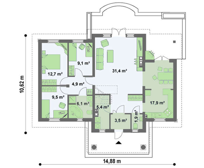Проект содержит три раздела – Архитектурный, Конструктивный и Инженерный: водоснабжение, отопление, вентиляция, канализация, электроснабжение (приобретается за дополнительную плату) + Пояснительная записка.