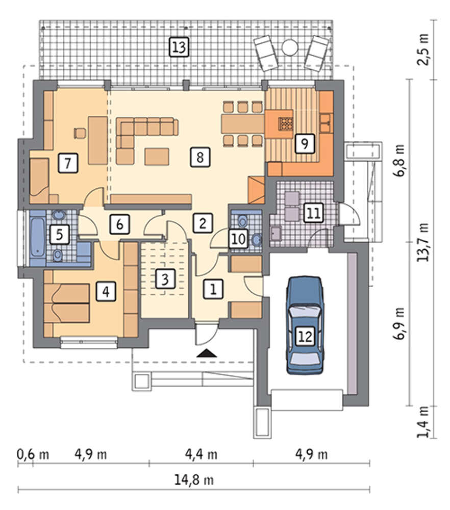 Проект содержит три раздела – Архитектурный, Конструктивный и Инженерный: водоснабжение, отопление, вентиляция, канализация, электроснабжение (приобретается за дополнительную плату) + Пояснительная записка.