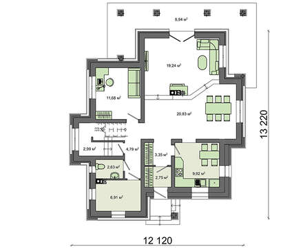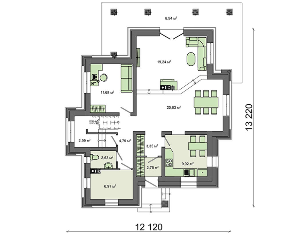 Проект содержит три раздела – АрхитектурныйКонструктивный и Инженерный: водоснабжение, отопление, вентиляция, канализация, электроснабжение (приобретается за дополнительную плату) + Пояснительная записка.