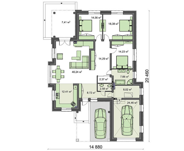 Проект содержит три раздела – Архитектурный, Конструктивный и Инженерный: водоснабжение, отопление, вентиляция, канализация, электроснабжение (приобретается за дополнительную плату) + Пояснительная записка.