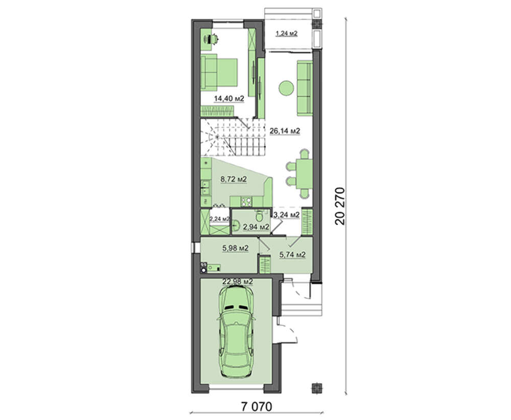 В пространство первого этажа включен гараж, он вынесен в торец здания, выполнен обособленно, планировка не позволит шуму работающего двигателя потревожить покой домочадцев. Большую часть первого этажа занимают помещение общего настроения. Кухня соединена со столовой и гостиной, предусмотрено отдельное пространство для хранения инвентаря и съестных запасов. Лестница находится в центре гостиной, что позволило условно разделить помещение на зоны разного назначения и дает возможность хозяйке готовить великолепные обеды без посторонних свидетелей.