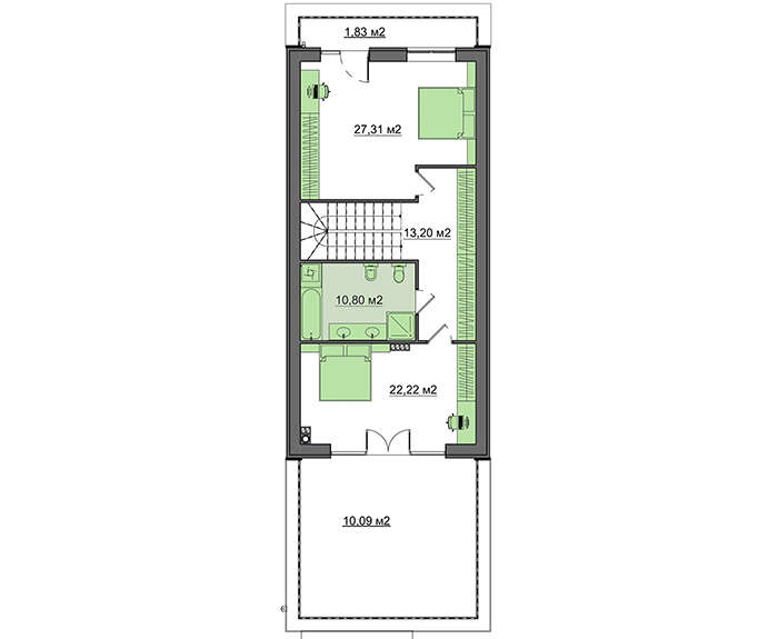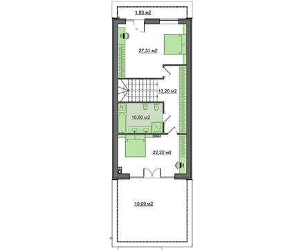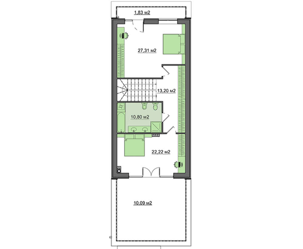 Планировка предполагает три личных помещения. Спальня меньшей площади находится на первом этаже, максимально приближена к гостиной и кухне. Хозяин комнаты всегда будет находиться в центре семейных событий. Оставшиеся две спальни перенесены на второй этаж. Здесь созданы комфортные условия для жизни, имеется просторный санузел и вместительные гардеробы. Они имеют солидную комнату, каждая с личной террасой, что дает возможность много времени проводить на свежем воздухе и принимать солнечные ванны.