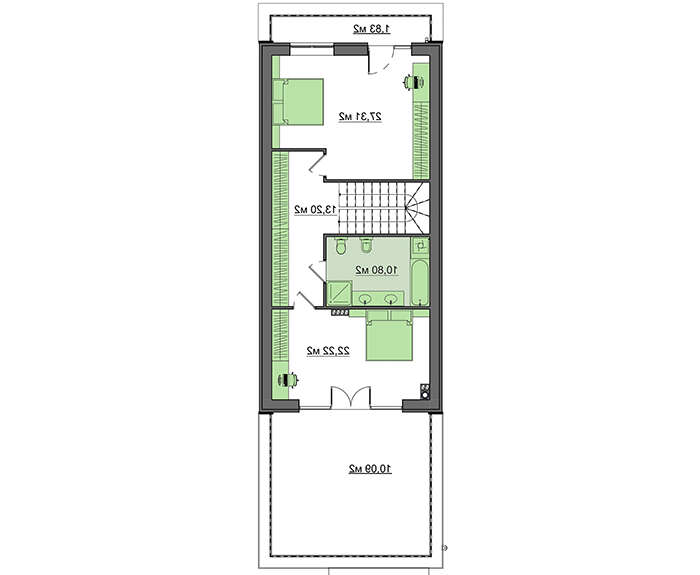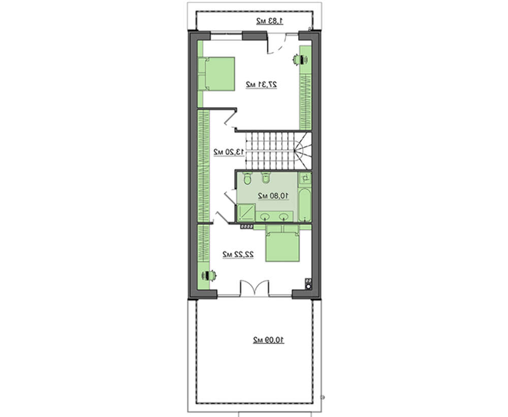 Планировка предполагает три личных помещения. Спальня меньшей площади находится на первом этаже, максимально приближена к гостиной и кухне. Хозяин комнаты всегда будет находиться в центре семейных событий. Оставшиеся две спальни перенесены на второй этаж. Здесь созданы комфортные условия для жизни, имеется просторный санузел и вместительные гардеробы. Они имеют солидную комнату, каждая с личной террасой, что дает возможность много времени проводить на свежем воздухе и принимать солнечные ванны.