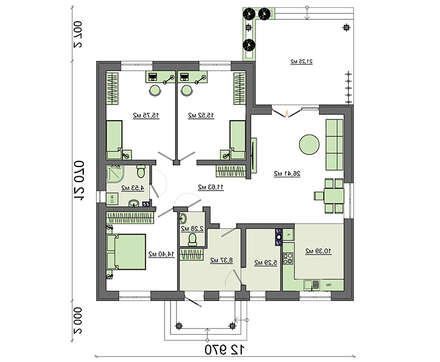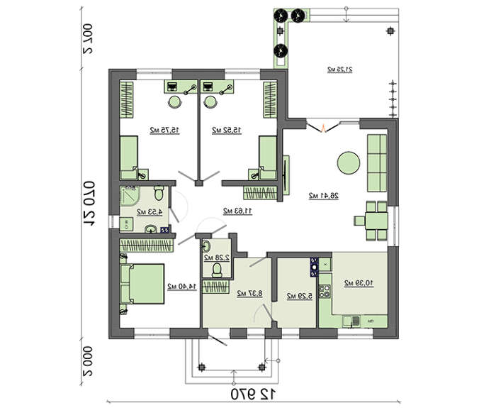 Проект содержит три раздела – Архитектурный, Конструктивный и Инженерный: водоснабжение, отопление, вентиляция, канализация, электроснабжение (приобретается за дополнительную плату) + Пояснительная записка.