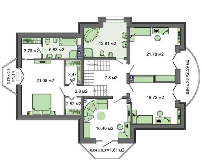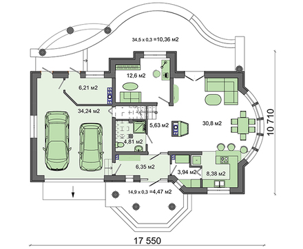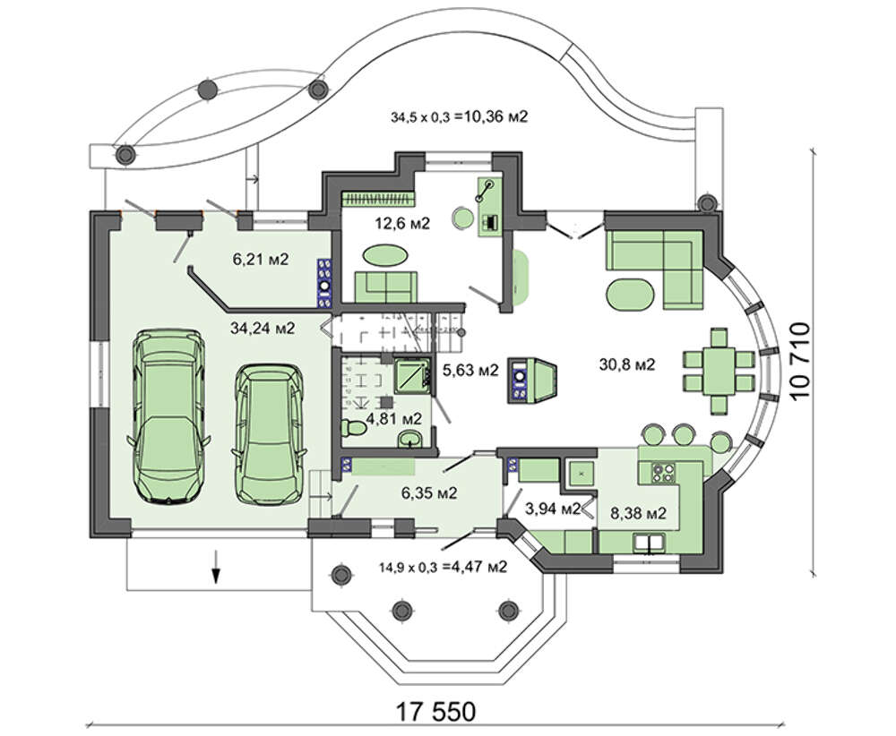 Внутри дома все продумано и направлено на создание комфортных условий для проживания. Вместительный гараж имеет достаточные размеры чтобы два автомобиля расположились внутри не мешая друг другу. Жилая площадь характеризуется достаточным количеством помещений для личного проживания. Среди них особого внимания заслуживают хозяйские апартаменты второго этажа, в габариты которых включены дополнительные площади для размещения санитарных удобств и хранения стильного гардероба. Такое внимание будет высоко оценено хозяином — любителем комфорта и благоустройства.