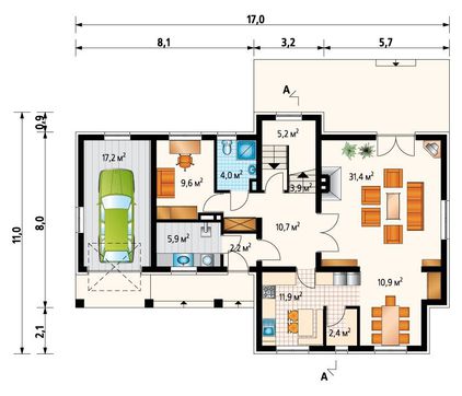 Проект содержит три раздела – Архитектурный, Конструктивный и Инженерный: водоснабжение, отопление, вентиляция, канализация, электроснабжение (приобретается за дополнительную плату) + Пояснительная записка.